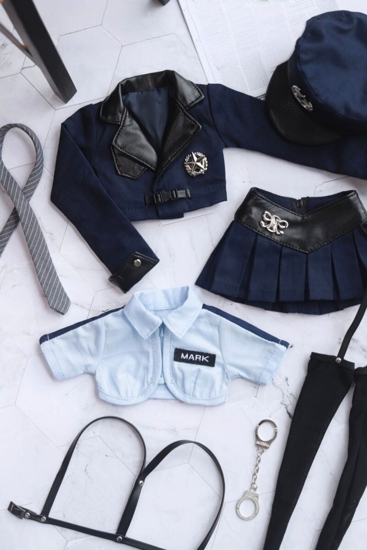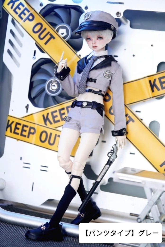 帽子、半袖シャツ、半ズボン、ストッキング、ベルト、手錠、上着、ネクタイ